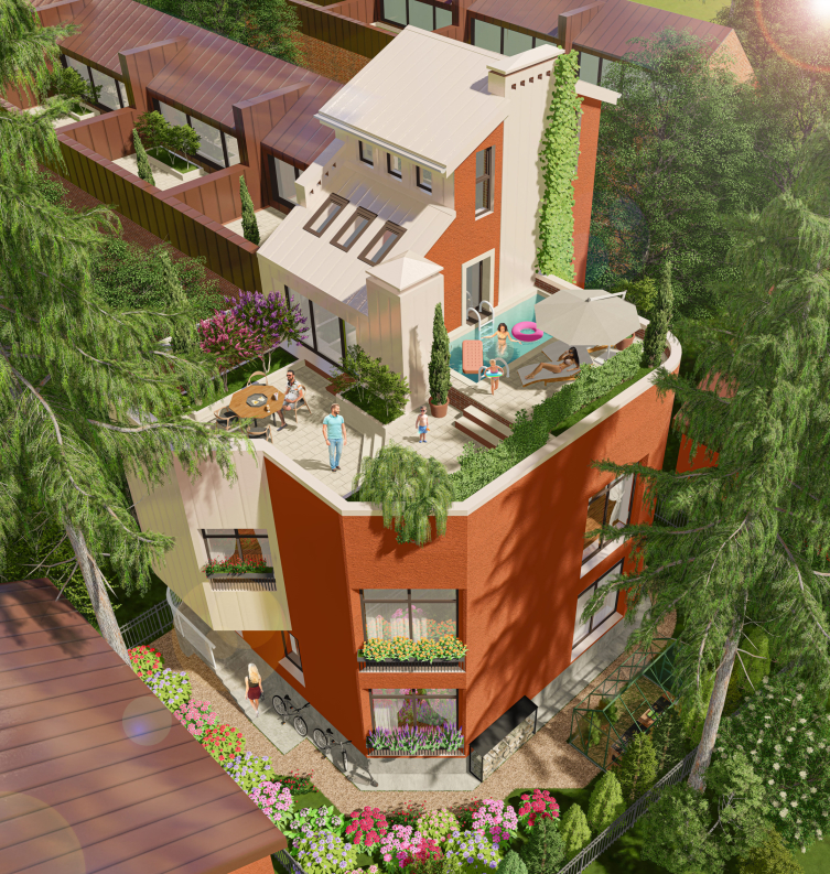 Небольшой размер земельного участка компенсируется возможностью использования большой террасы на кровле. На участке сохранены исторические деревья и почвенный покров. Здесь можно разбить красивые патио и посадить фруктовые деревья и кустарники. В данной части Квартала фактически закончен весь архитектурно-градостроительный облик окружающей застройки, в котором удалось воплотить гармоничную и качественную среду для жизни горожан. Ориентация «восток-юг-запад» обеспечивает максимальное получение солнечного света.