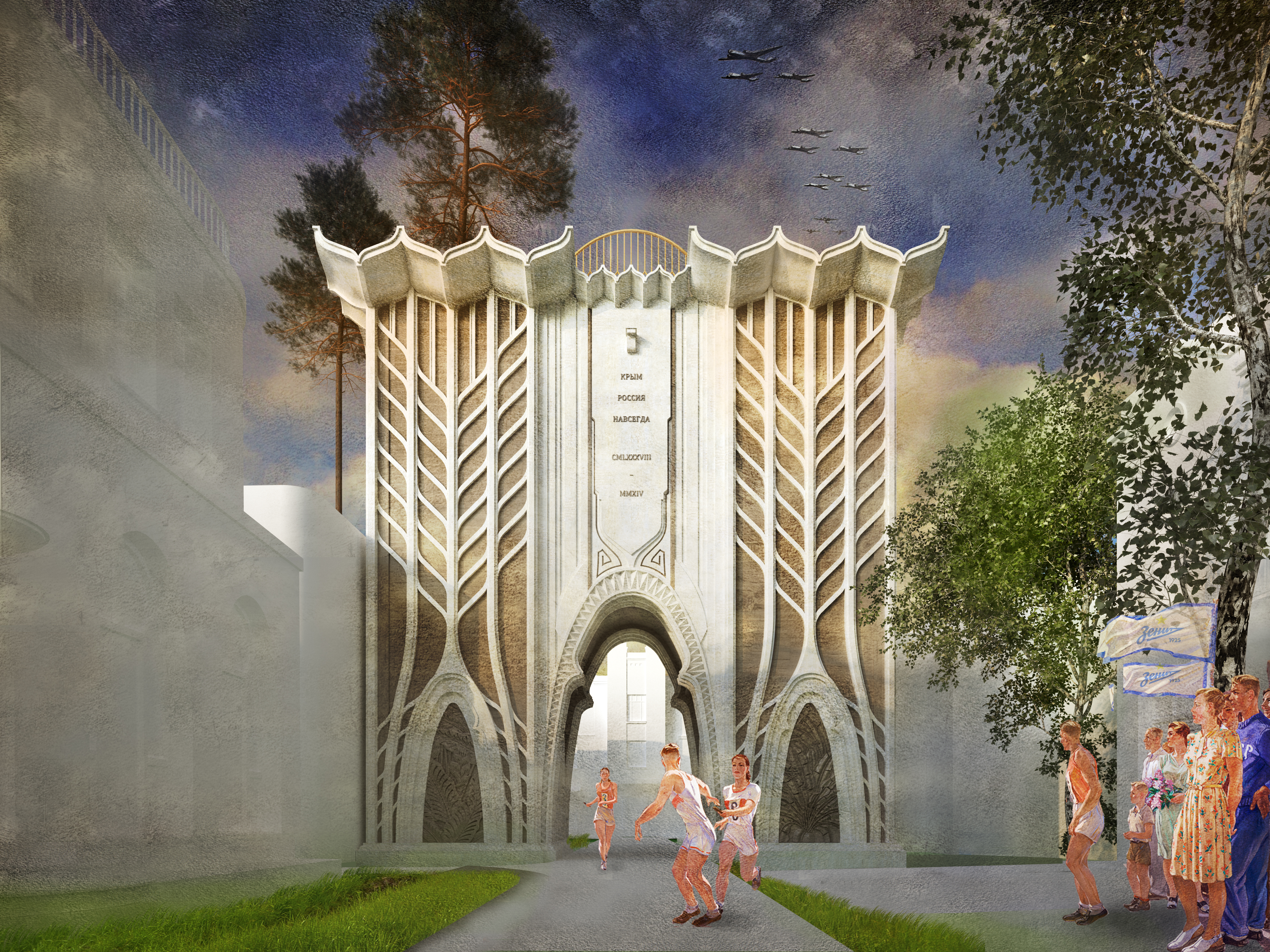 Триумфальные арки всегда были неотъемлемой частью городского развития. Они устанавливались в честь важнейших событий, побед, торжественных моментов жизни. Арки занимали центровые точки площадей, проспектов, а позже, теряя монументальность, проявились в оформлении улиц, проездов, элементов пространства жилых комплексов. Арка “Прибрежного Квартала” является приближенной копией Арки Тита в Риме. Она возвращает нас к важности значения триумфа, а в эпоху цифровизации она наделяется еще и жилой функцией.