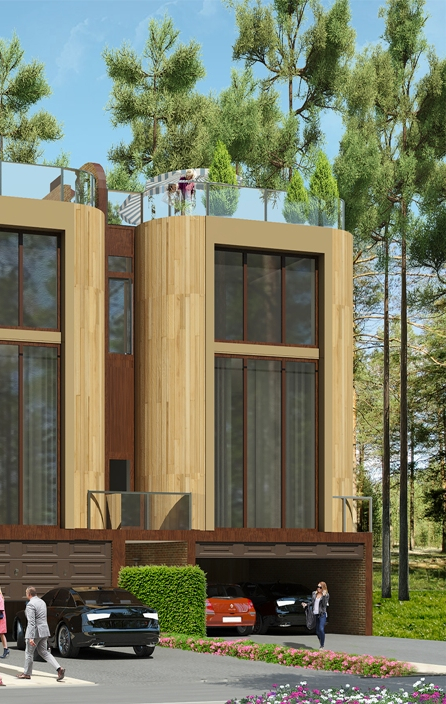 Третий этаж имеет возможность организации 4 жилых комнат, просторного холла 20 м2. Вид на сосновый лес и красивый ландшафт. Эксплуатируемая кровля-терраса открывает замечательные виды, окружена бережно сохраненными вековыми деревьями. При желании можно развить проект благоустройства и озеленения террасы на крыше. Также каждый дом имеет небольшое озелененное патио со стороны Прибрежного Квартала.